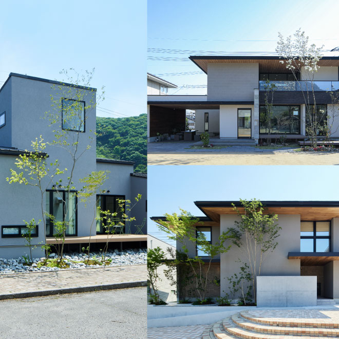 - ブラウン系の色違いの瓦で南欧風のイメージ。住まいの顔となる外構、緑豊かなお庭もポイントです。