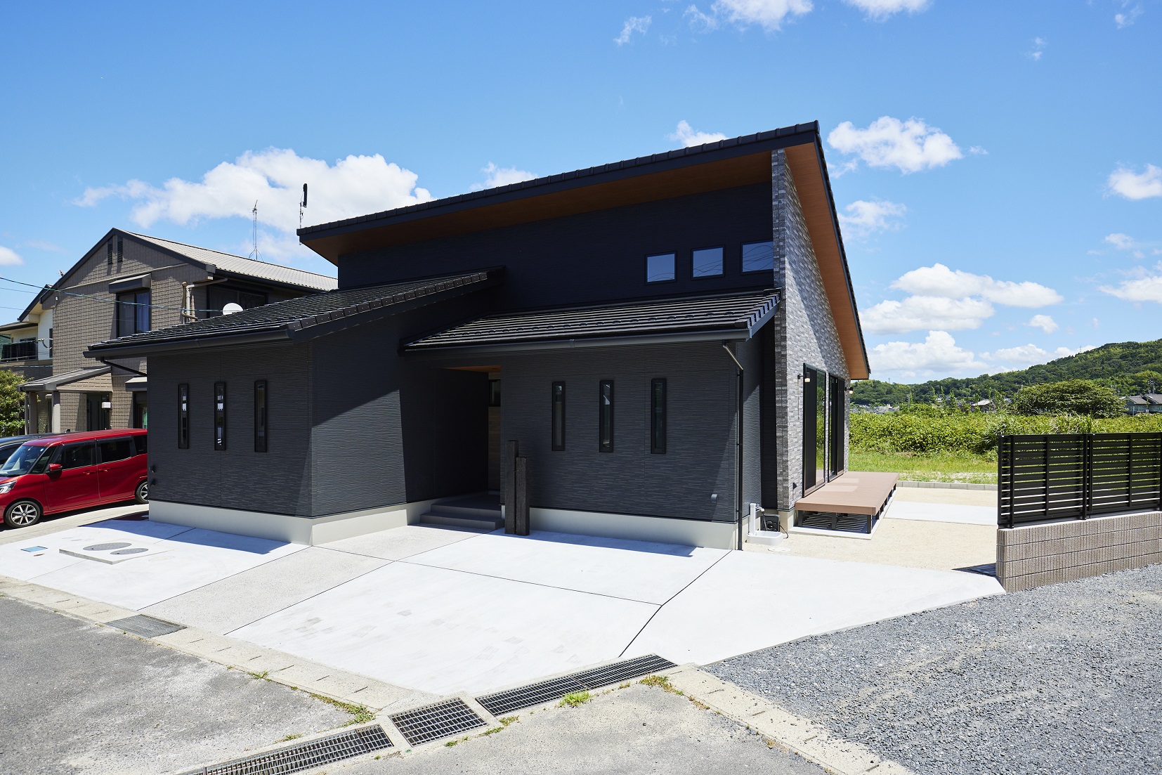 一見2階建てのように感じる存在感とインパクトのある外観。スタイリッシュな色合いにもこだわりました。サイドから見た時の勾配屋根のデザインもお気に入りだそう。